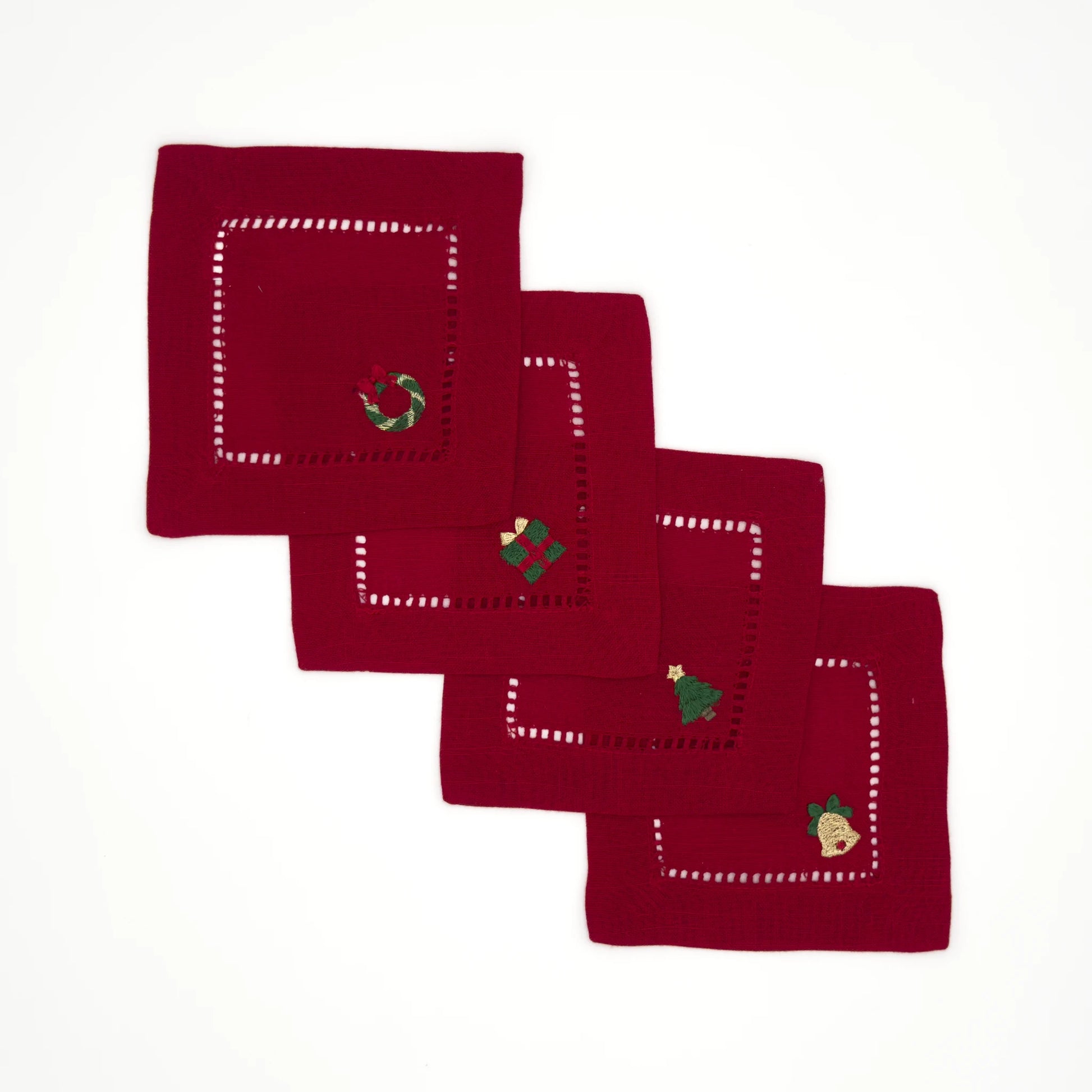 Christmas Embroidered Cocktail Napkins - Red with Holiday Symbols (Set of 4)